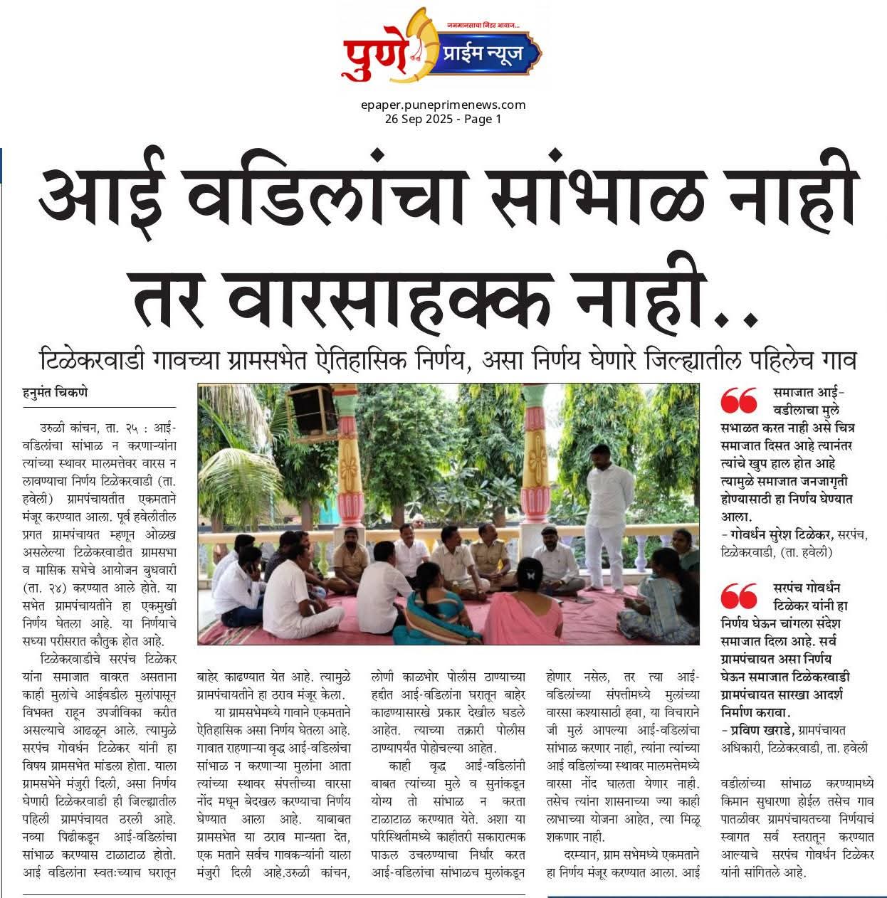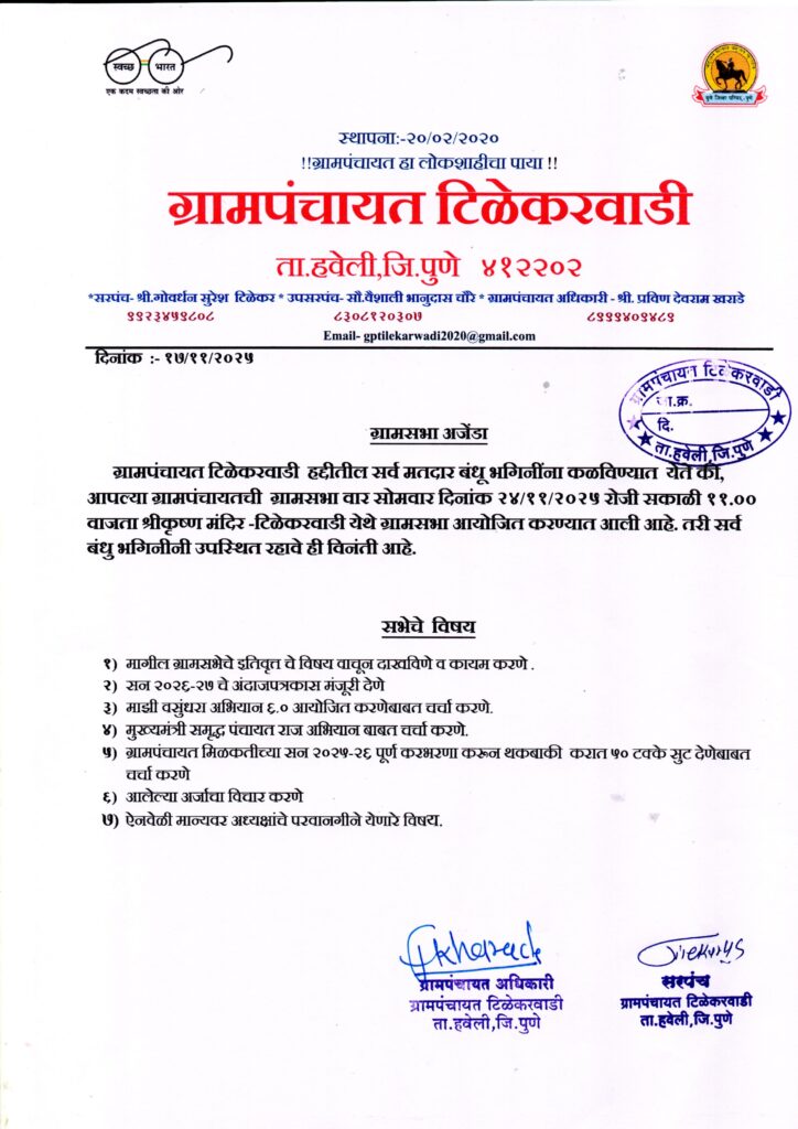 पुणे जिल्ह्यातील हवेली येथील टिळेकरवाडी ग्रामपंचायत स्वच्छ, शिक्षित आणि डिजिटलदृष्ट्या सक्षम गाव निर्माण करण्यासाठी वचनबद्ध आहे. आम्ही स्वच्छता, पाणीपुरवठा, ग्रामीण रस्ते सुधारण्यावर आणि सक्रिय नागरिकांच्या सहभागाद्वारे शाश्वत विकासाला चालना देण्यावर लक्ष केंद्रित करतो.